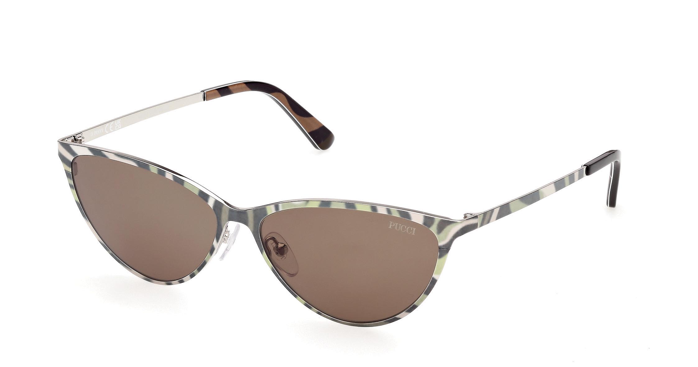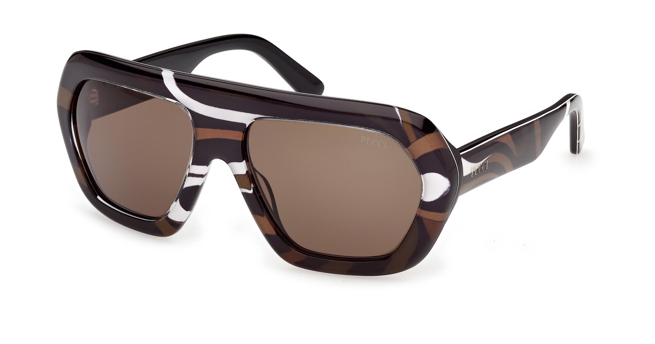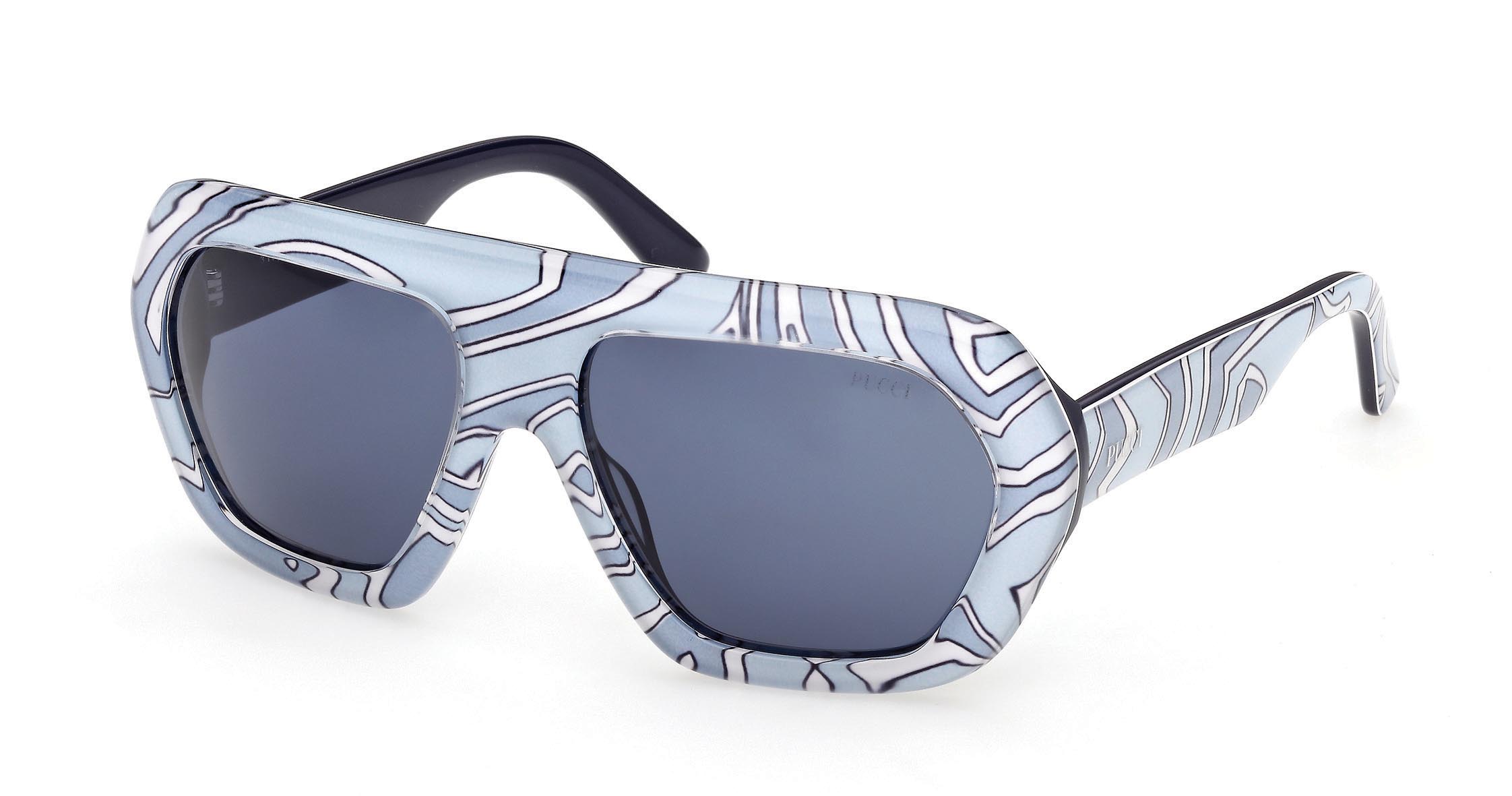 Le montature diventano vere e proprie superfici espressive, vestendosi dei motivi storici dell’archivio Pucci, reinterpretati attraverso un’intensa palette cromatica che evoca movimento e armonia. Tra queste, la celebre stampa Iride si rinnova attraverso combinazioni di colore fluide e avvolgenti, mentre la stampa Marmo, applicata su sofisticate montature in metallo, dà vita a sorprendenti giochi visivi capaci di esaltare la tridimensionalità delle forme.
