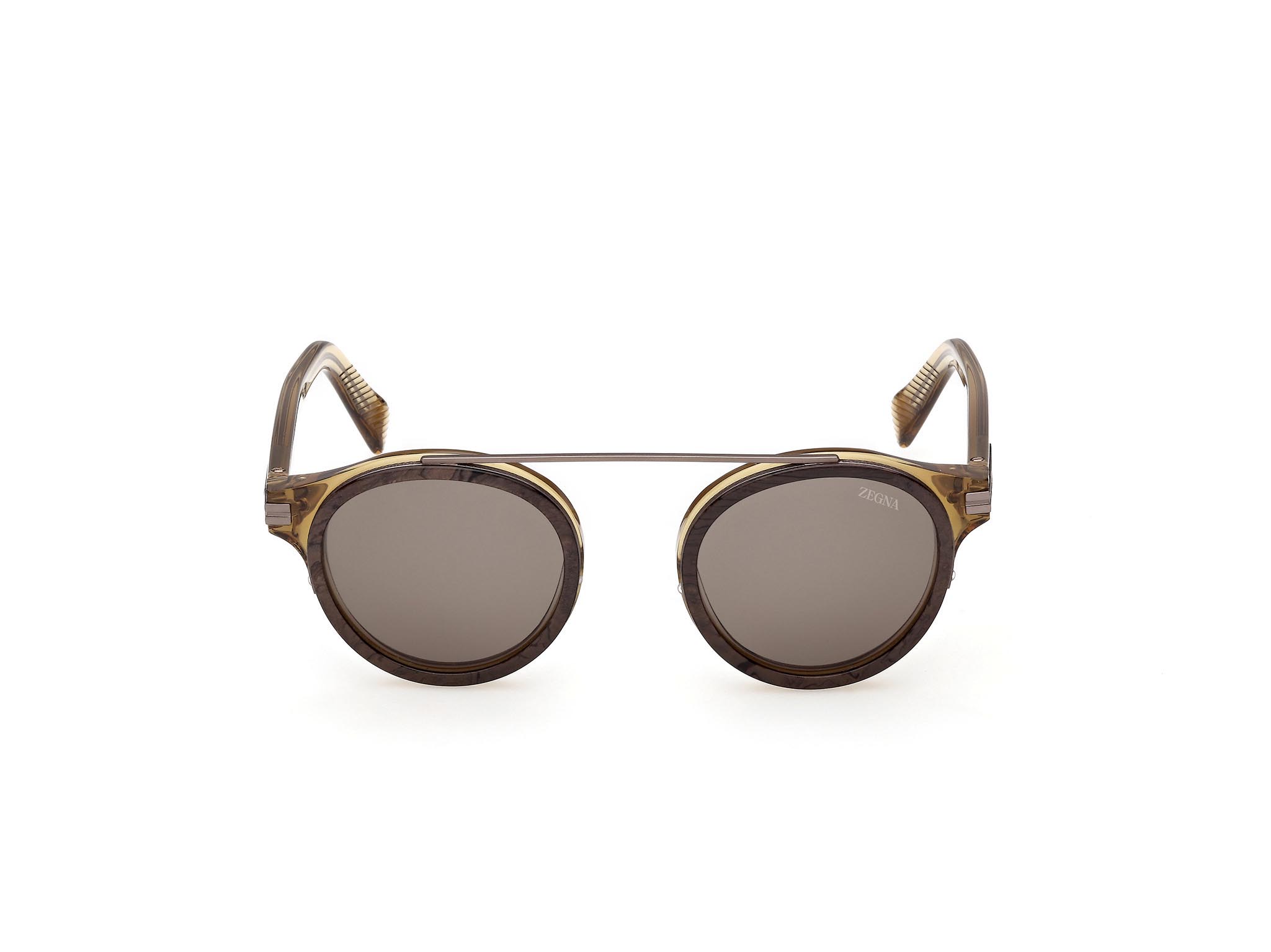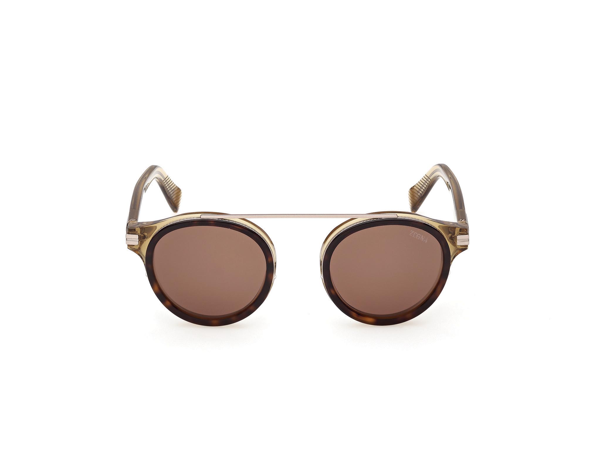 Round sunglasses are defined by a bridgeless silhouette with a high top bar, featuring an engraved double-circle metal detail on the front. The contrast between the colour of the internal acetate rims and the temples adds a sophisticated touch. The model is distinguished by the iconic 232 Road brand mark and the engraved temple tips, ensuring optimal stability and comfort.