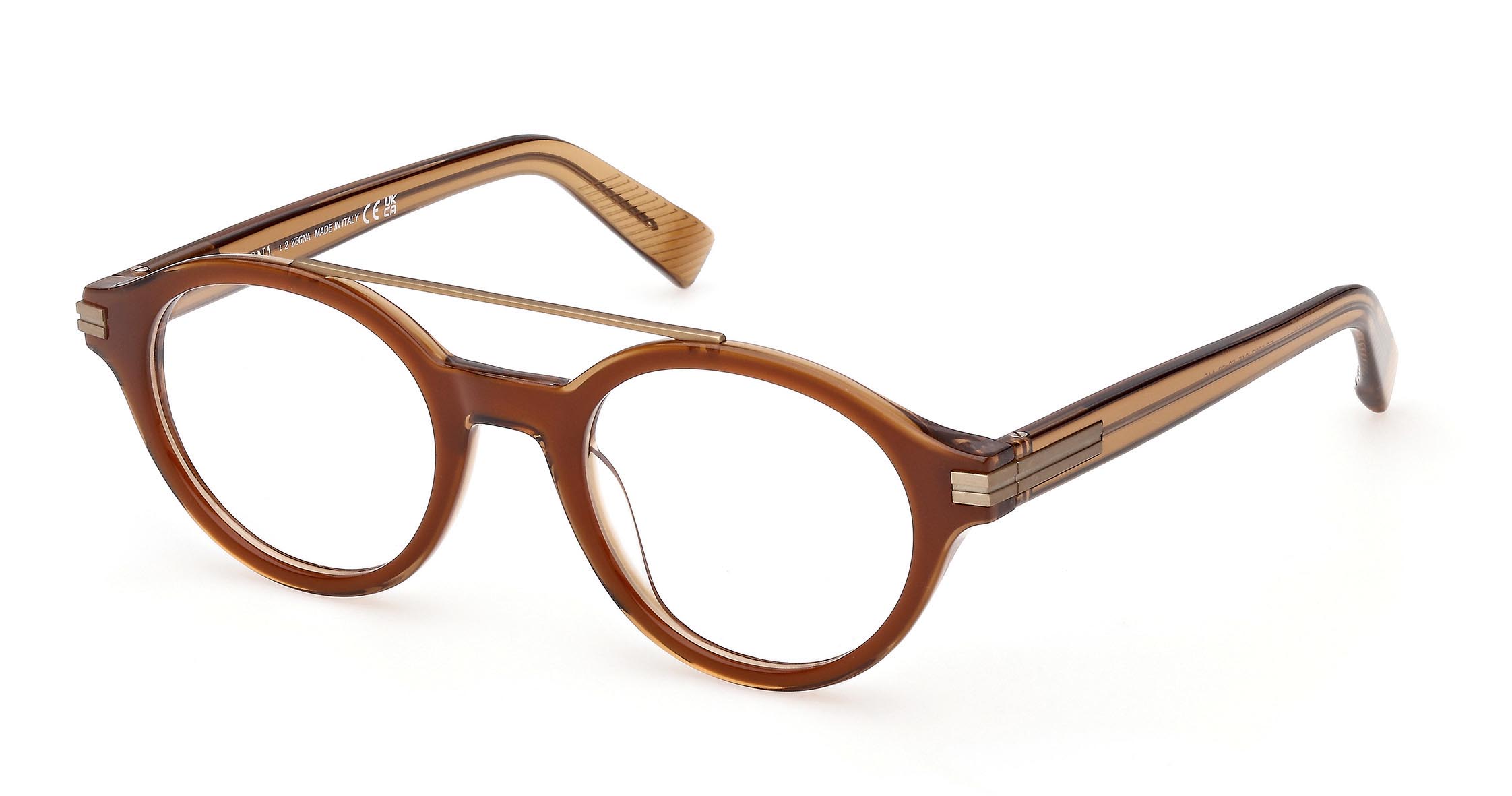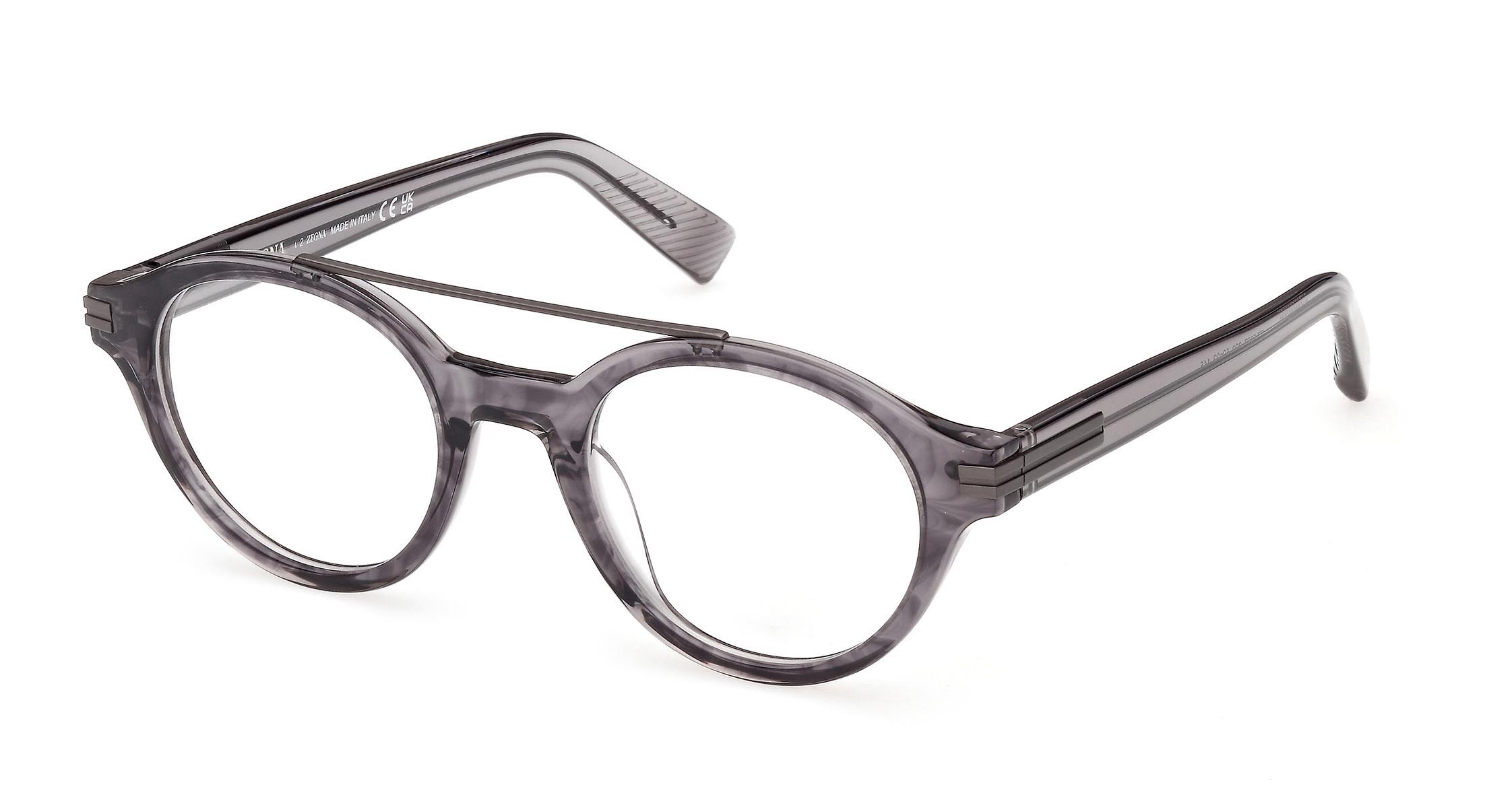 Round acetate frame with thin metal upper bridge. The frame front features a layered structure highlighted by a two-tone surface that gives the glasses a young, modern accent. The temples are embellished with the original metal 232 Road Brand Mark on the outside and the ZEGNA logo on the inside.