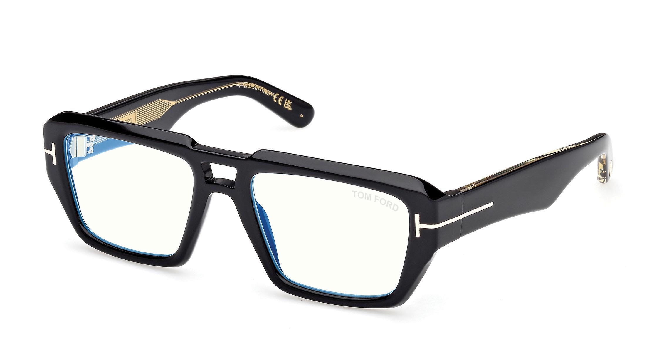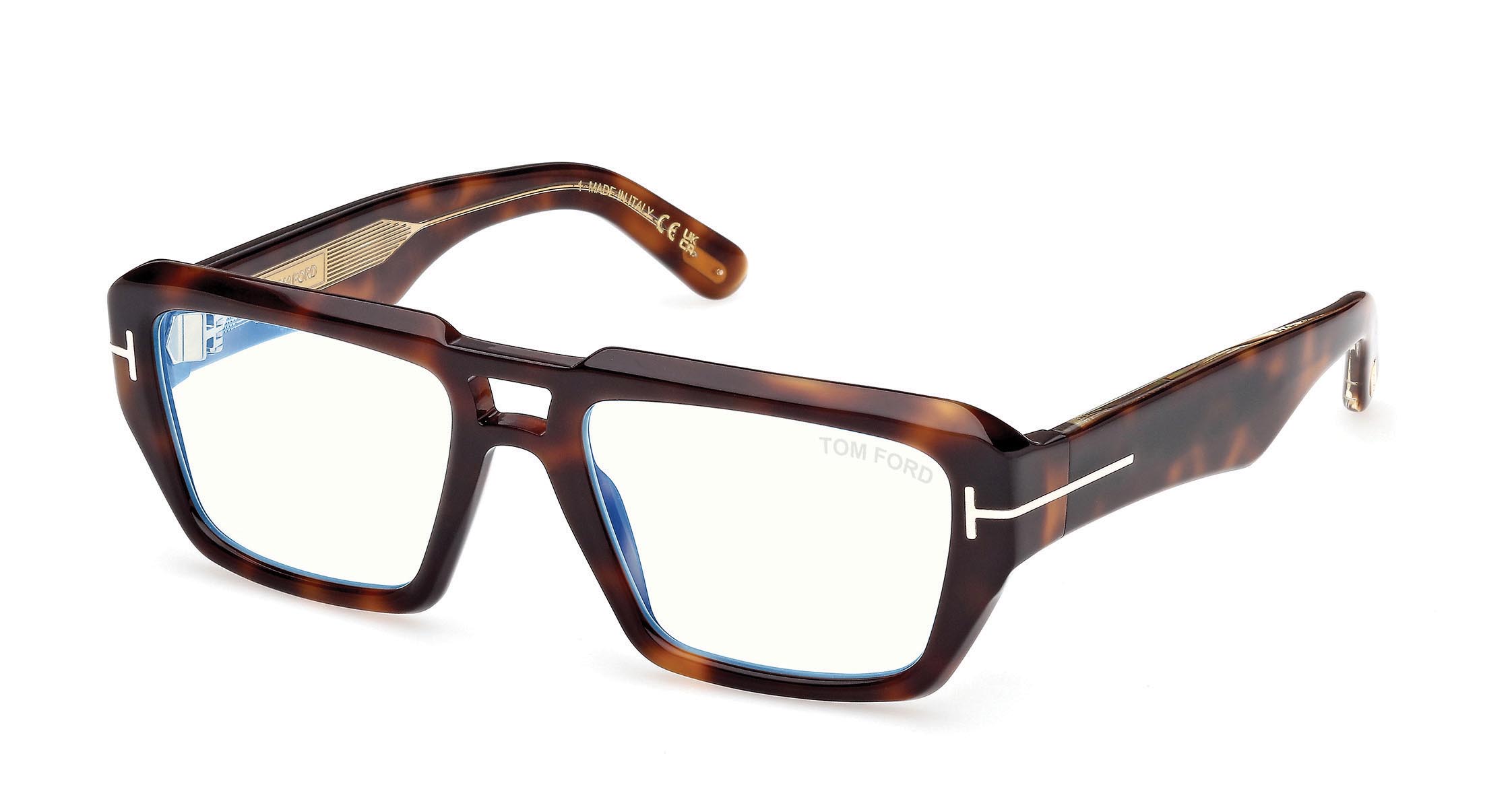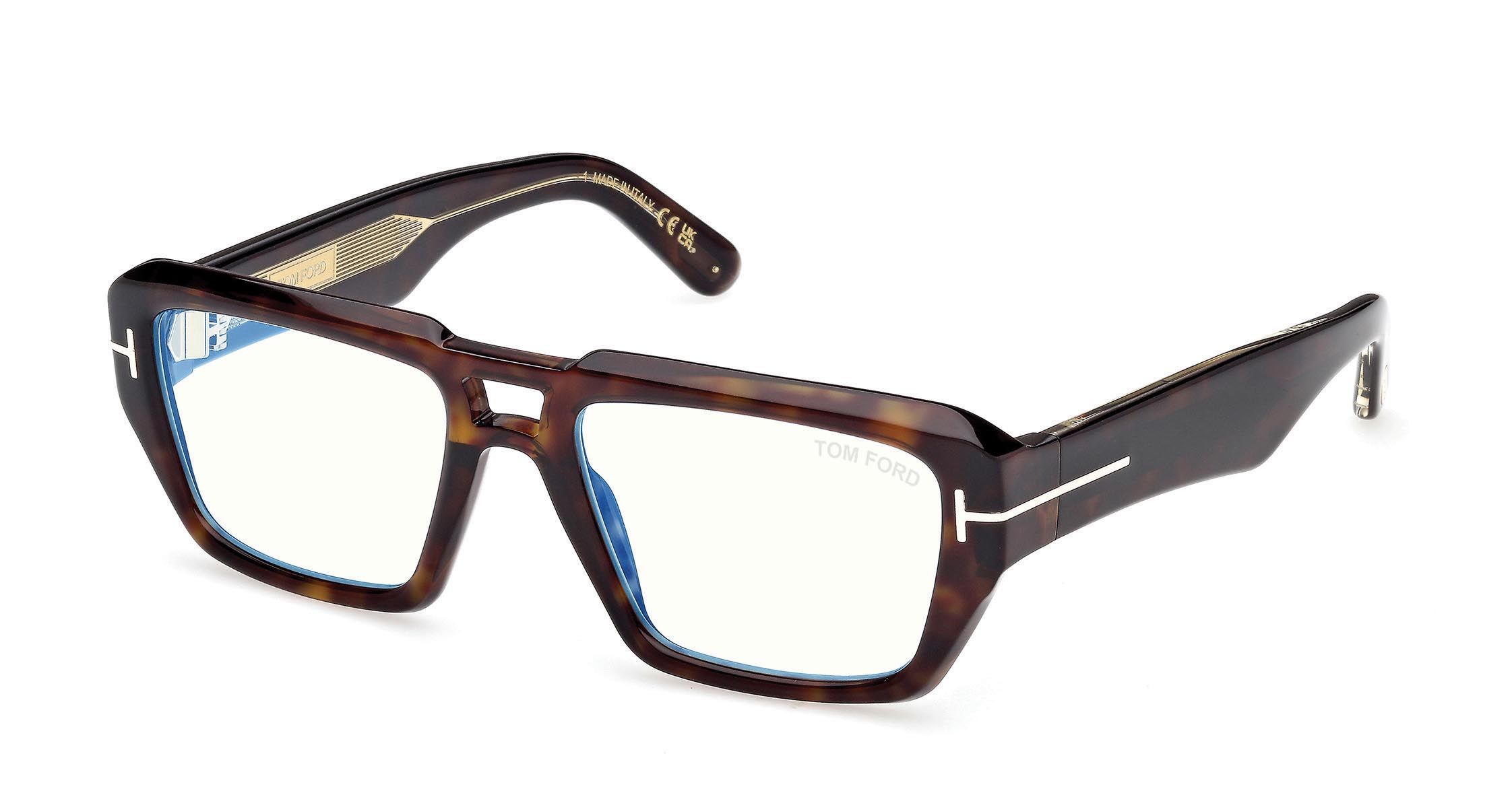Model with a slim double bridge and dynamic front geometries. The frame is characterized by thick temples with a modern design and lenses featuring Blue Block technology.