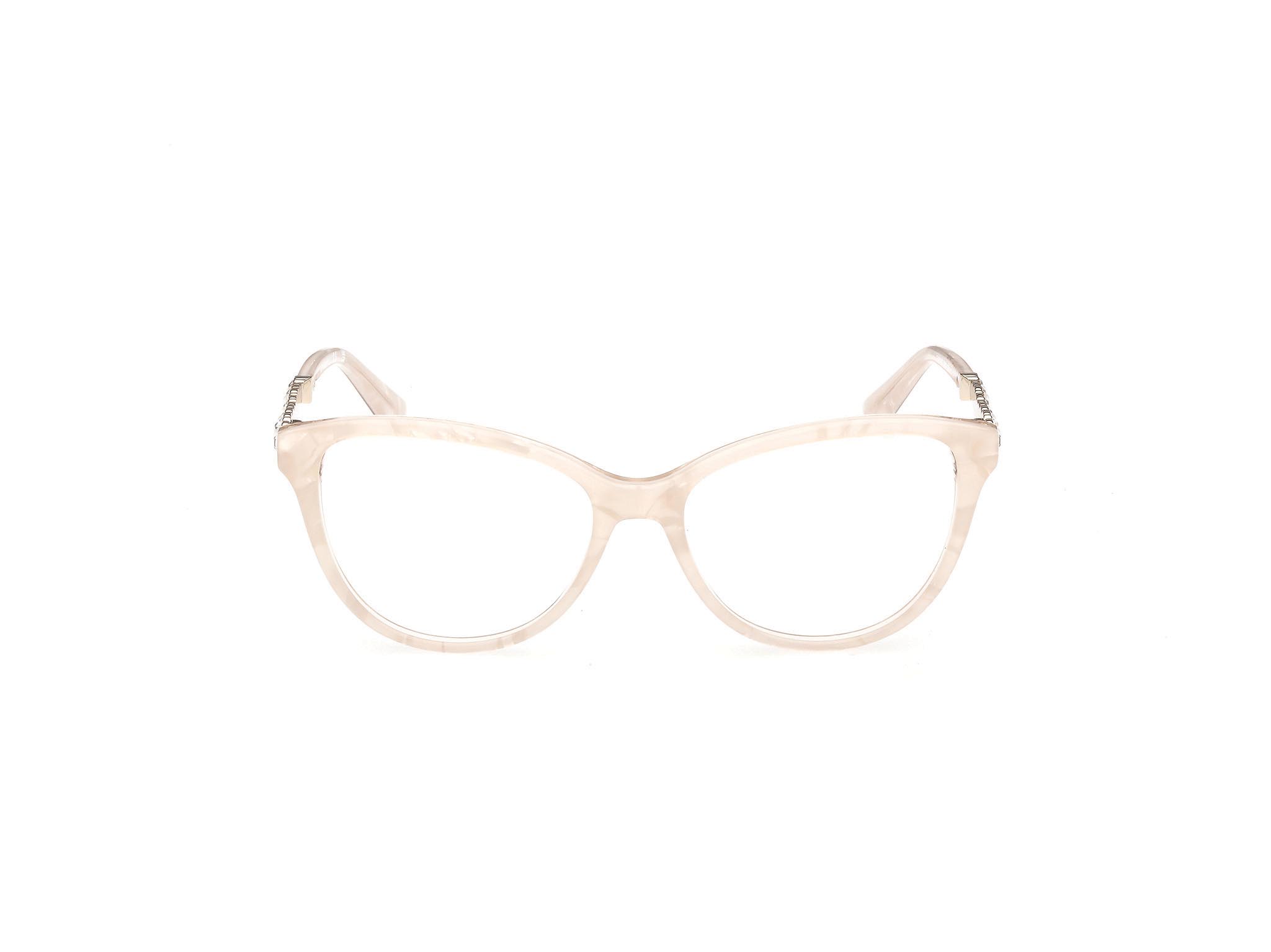 Chic round frame in pearlescent acetate, for a radiant look. Metal temples are accented with pearls and crystals, paired with extended acetate temple tips and the signature Marciano logo.