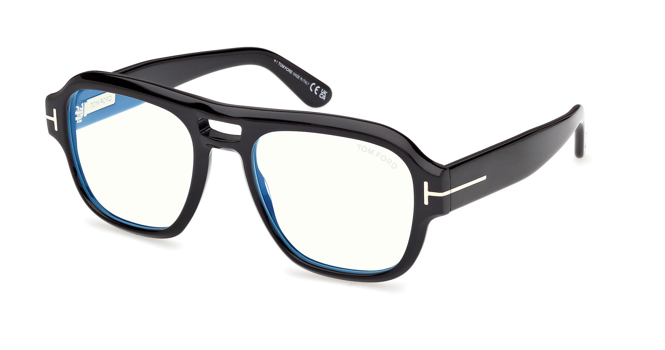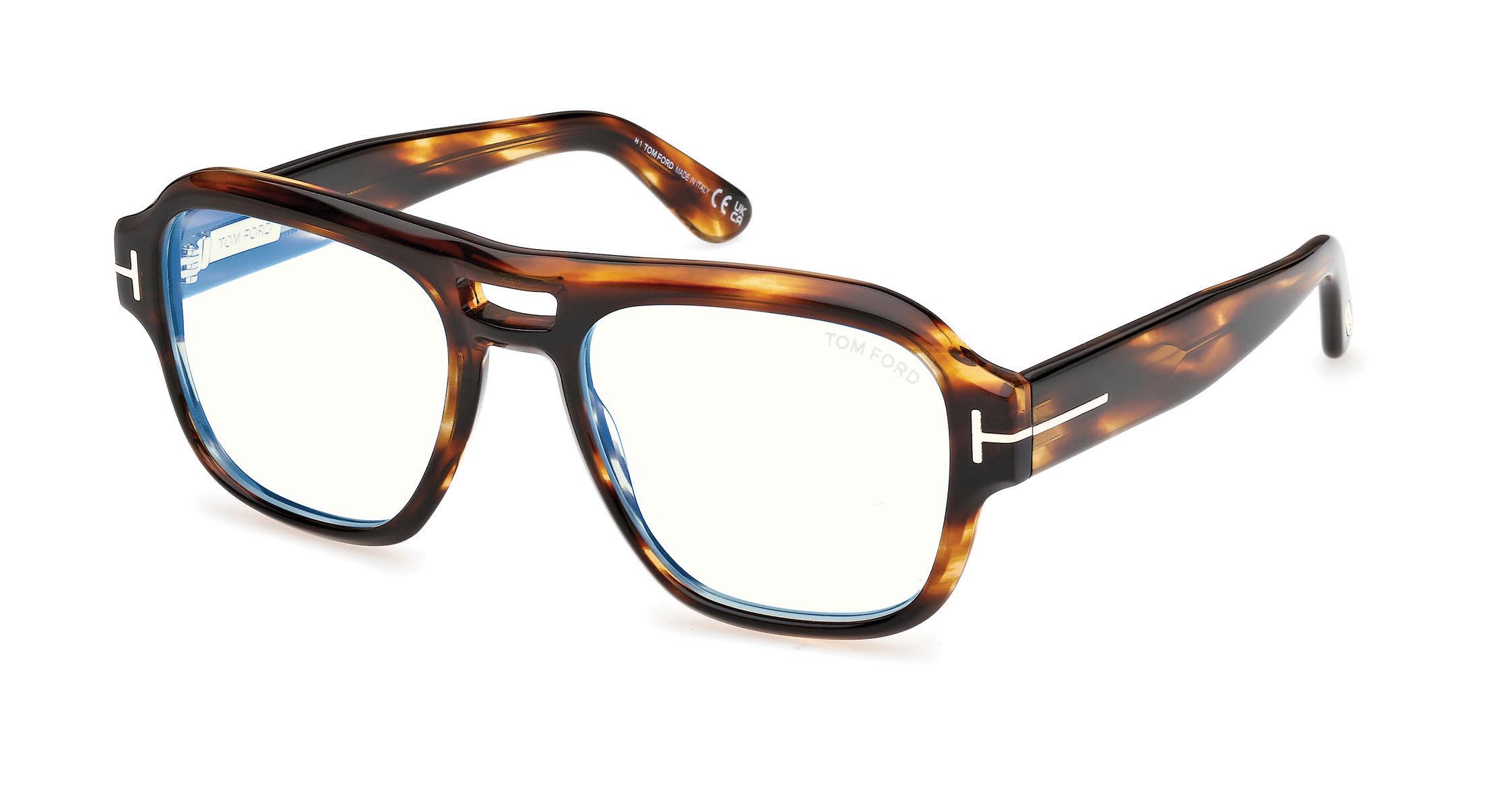 Montatura geometrica dal design sofisticato, con doppio ponte, profili morbidi e T logo sulle aste.