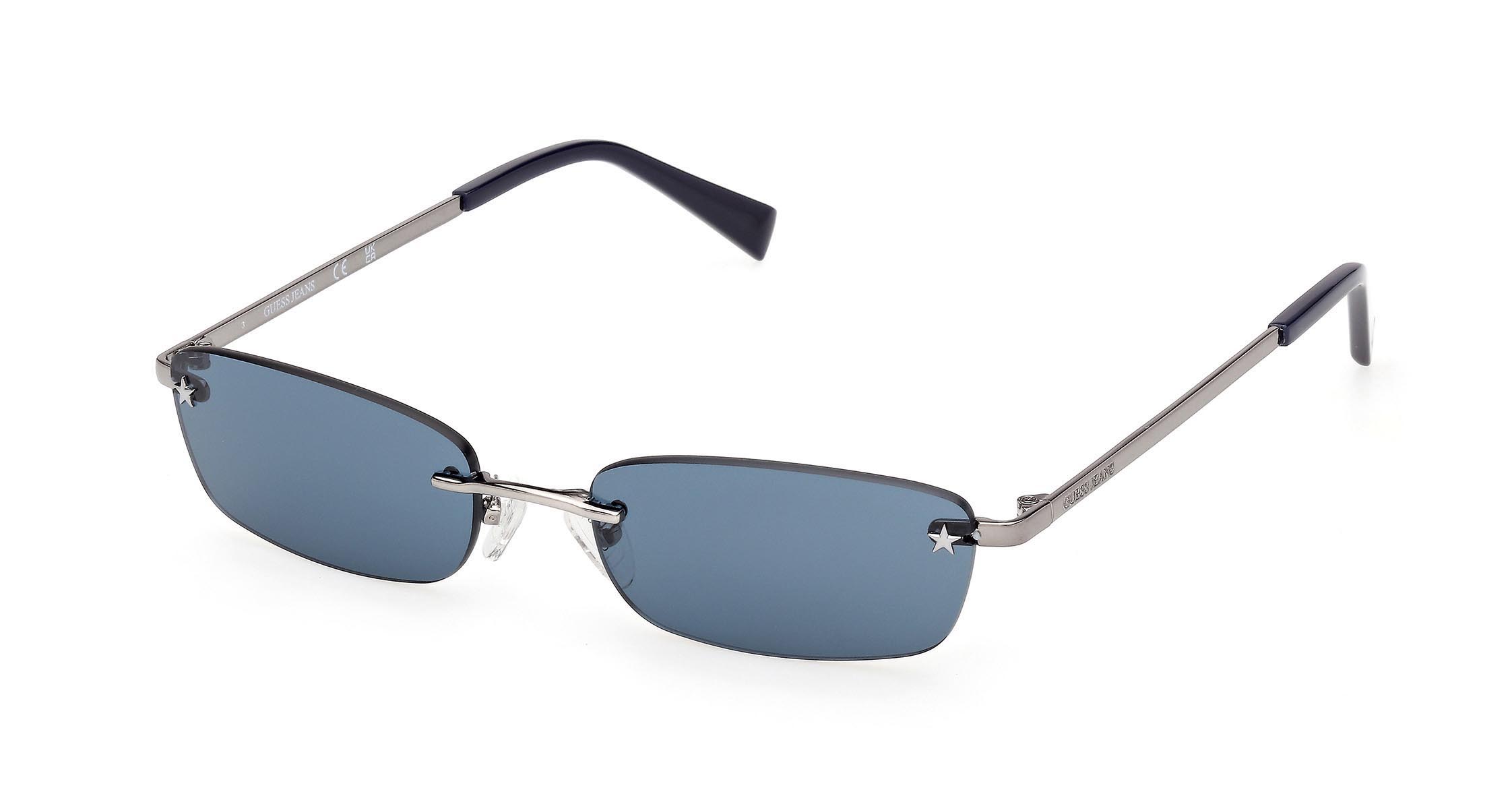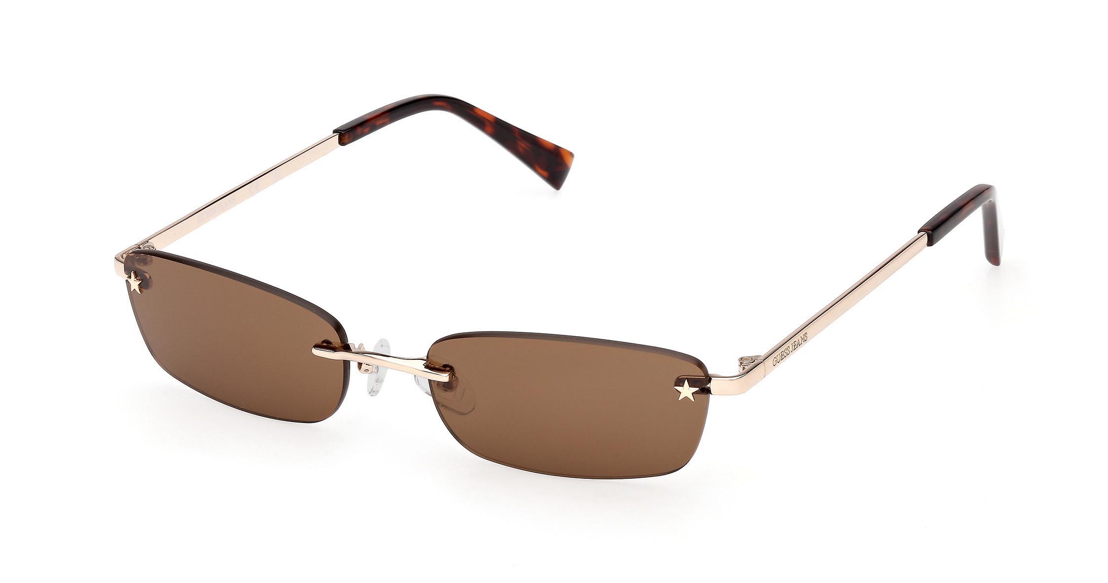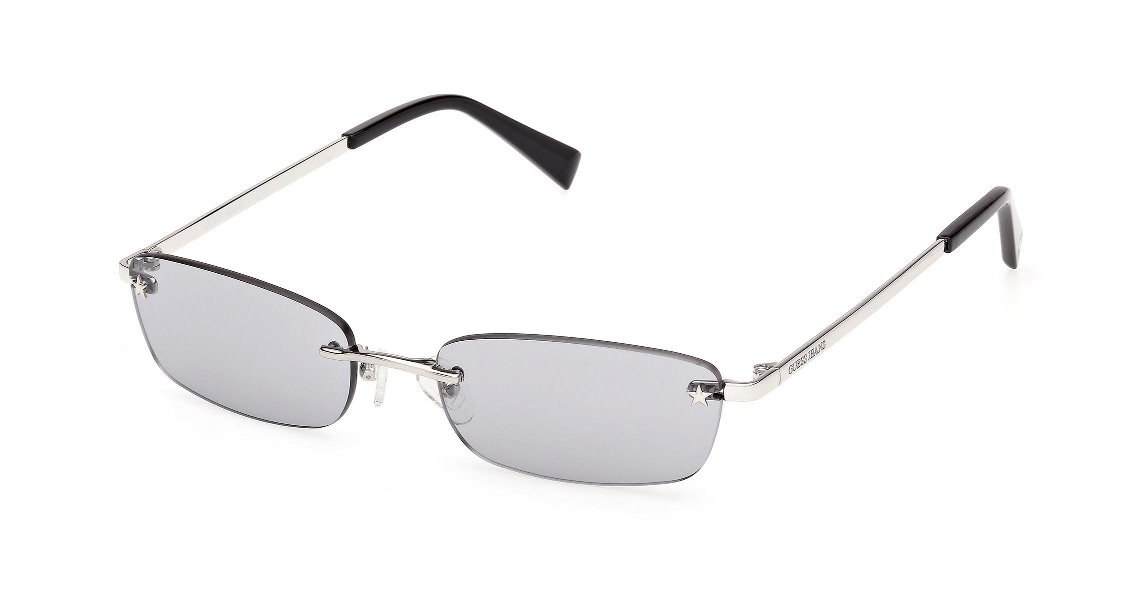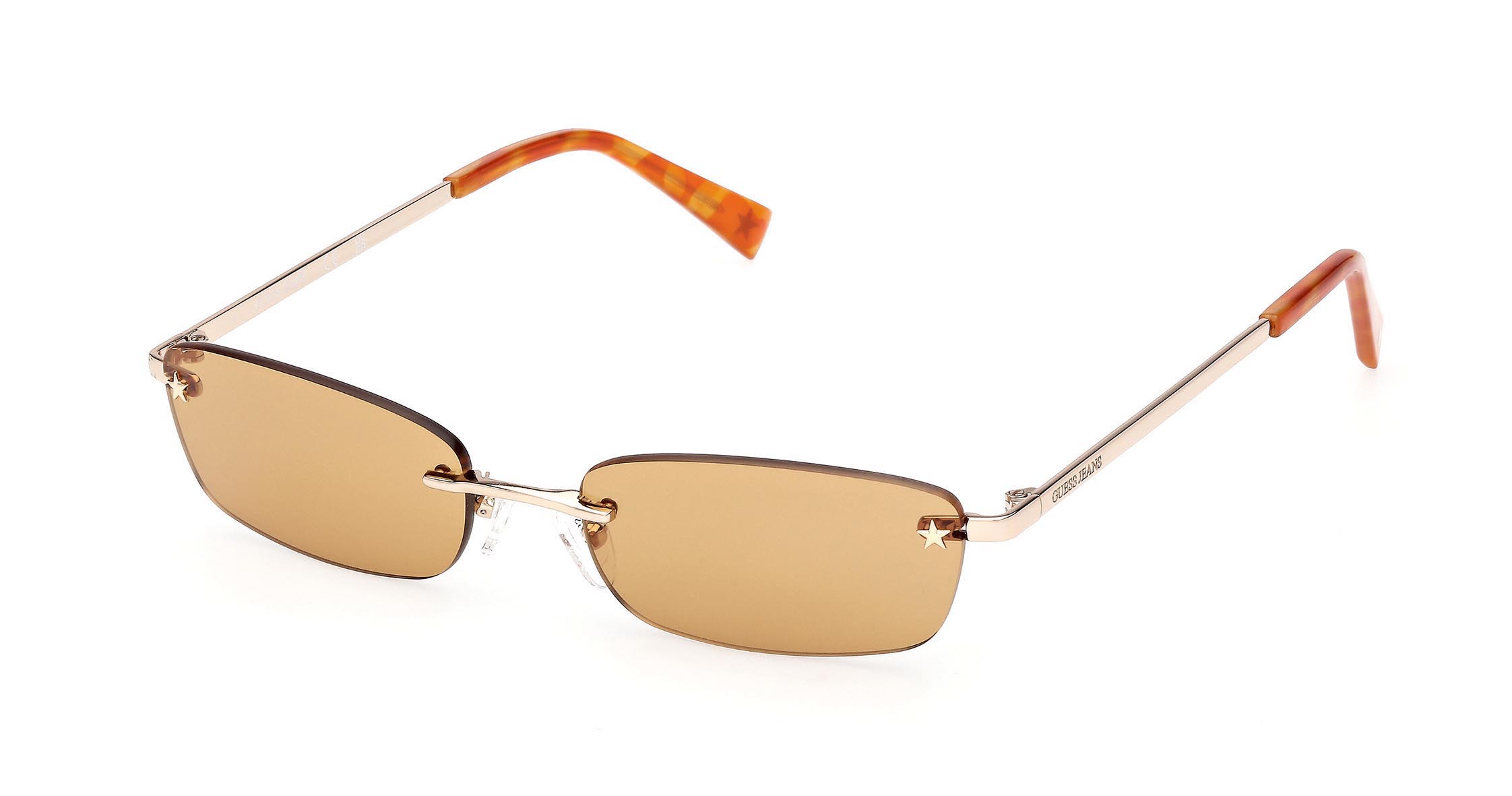 Montatura in metallo senza cerchio con lenti rettangolari. La stella, simbolo della collezione GUESS JEANS, è integrata nella parte frontale sia come dettaglio estetico sia come elemento funzionale, collegando il frontale alle aste. Ritorna anche come tocco iconico sui terminali in plastica iniettata.