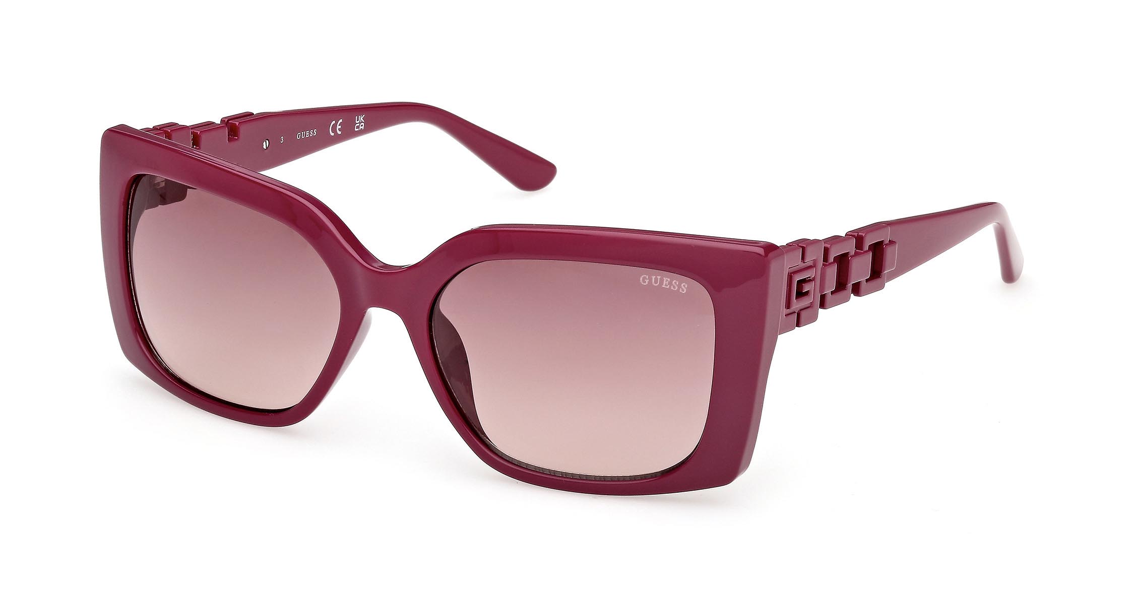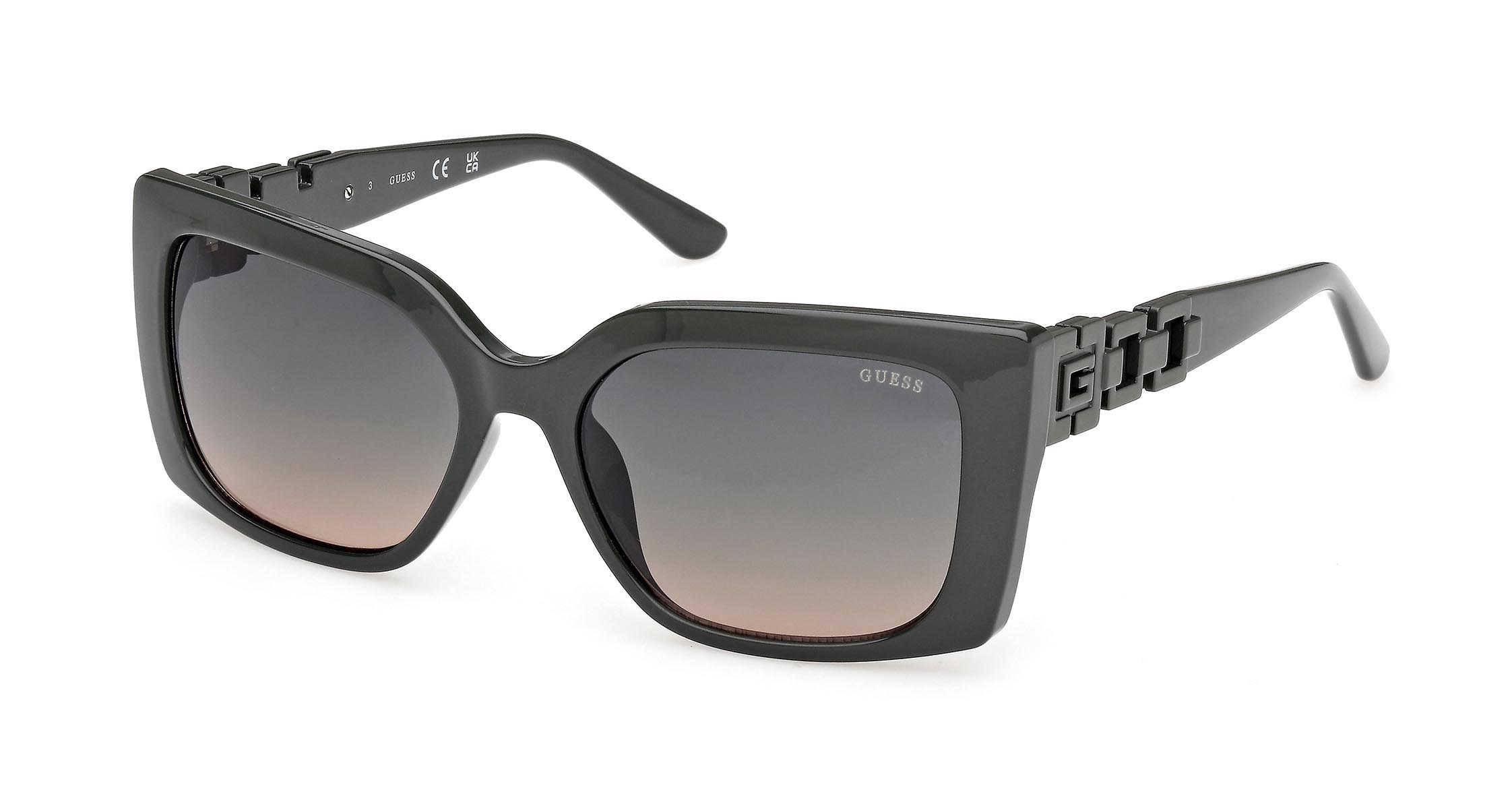 Occhiali da sole in plastica iniettata dal design geometrico e dal forte impatto visivo. Il frontale dalle linee nette e angolari si abbina a un’inedita forma delle aste, che reinterpretano in chiave moderna l’iconica catena GUESS.