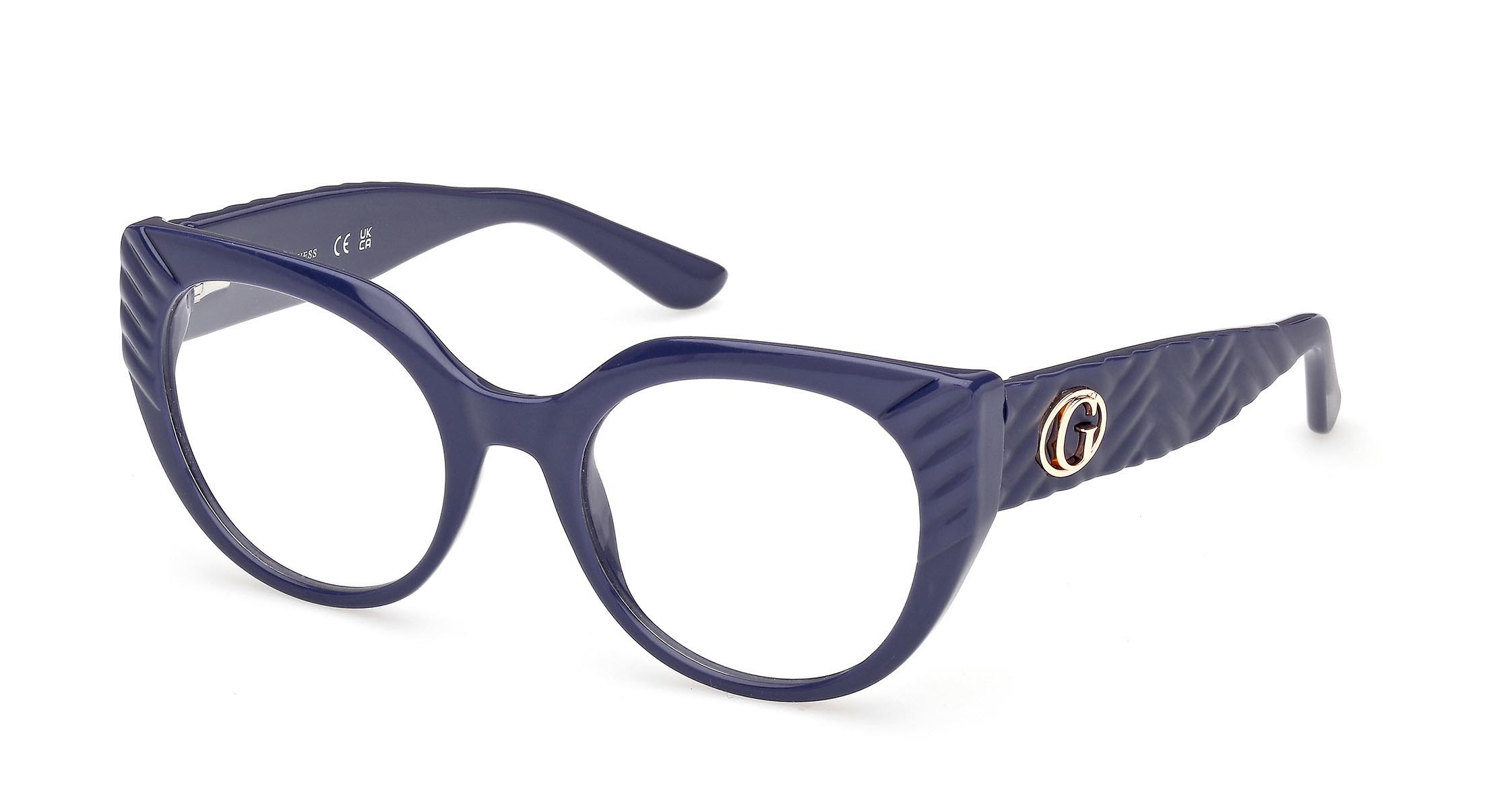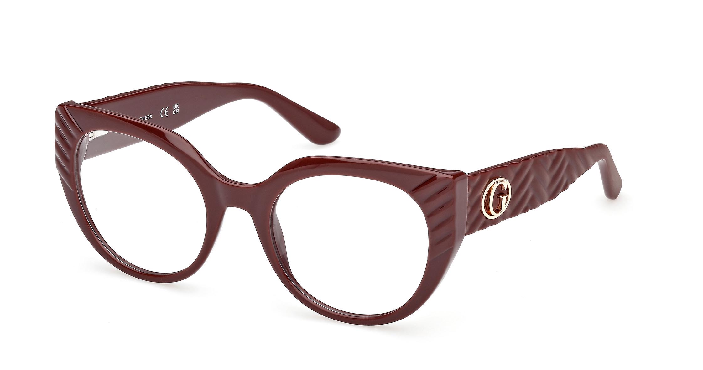 Montatura da vista femminile che bilancia perfettamente curve morbide e linee decise. Il design moderno è arricchito da superfici scolpite che creano un elegante effetto matelassé. Il logo “G” Forever GUESS decora con stile le aste.