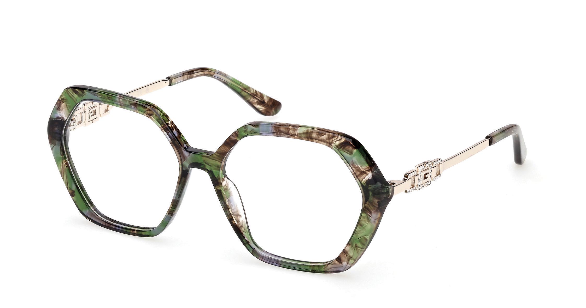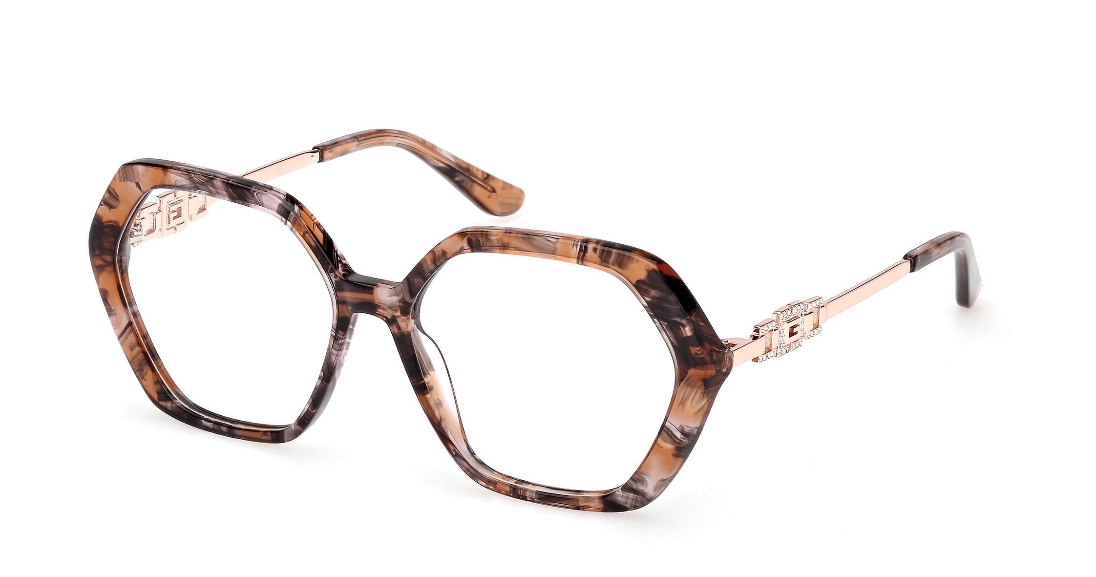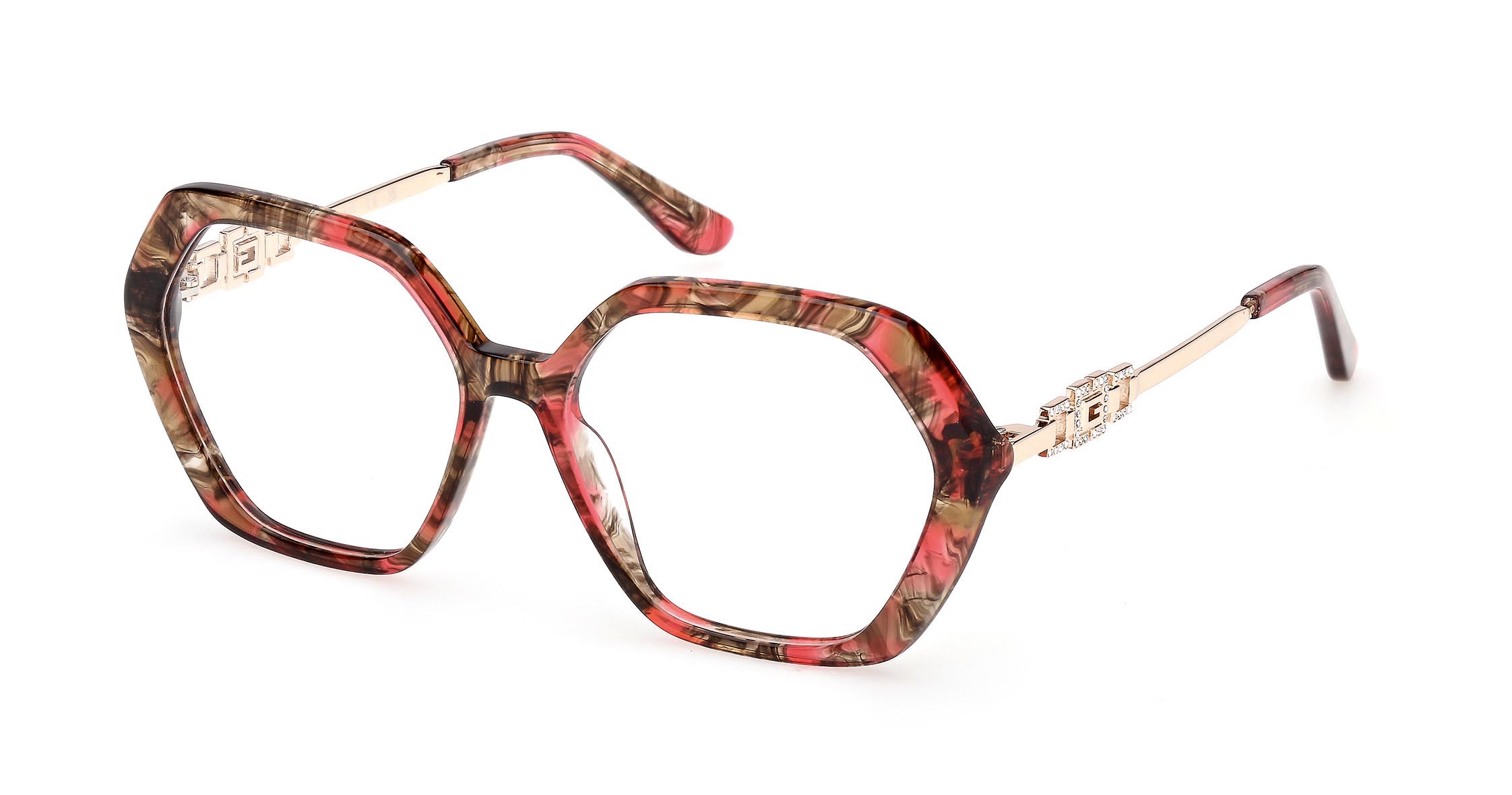 Occhiali da vista in acetato con frontale geometrico e silhouette glamour. Le aste in metallo sono impreziosite dall’iconico logo “G” squadrato decorato con pietre. La ricca palette cromatica include diverse tonalità effetto Havana.