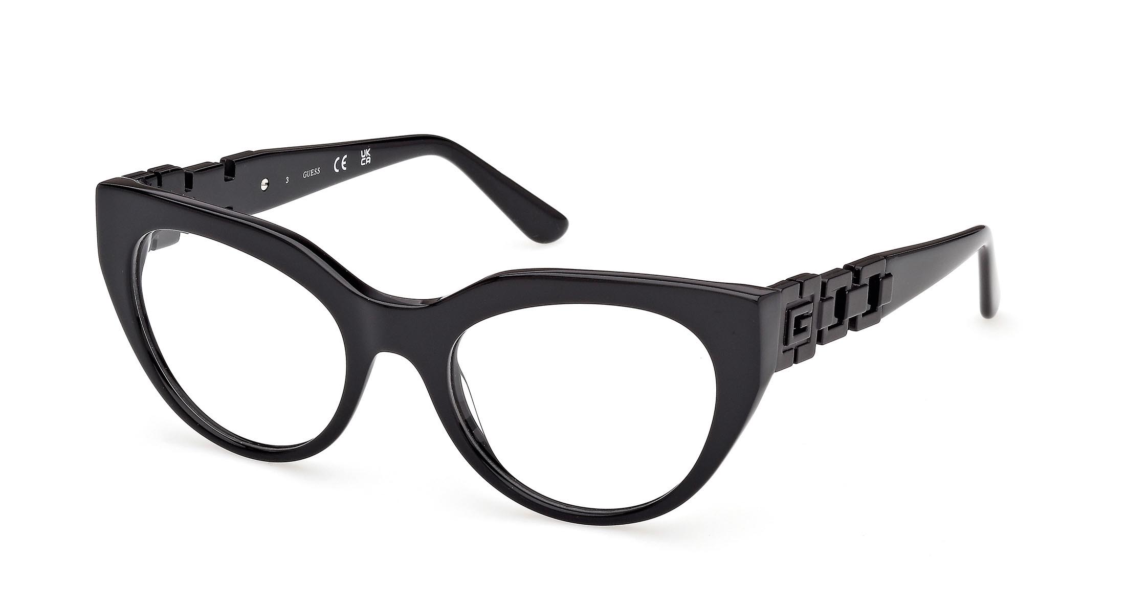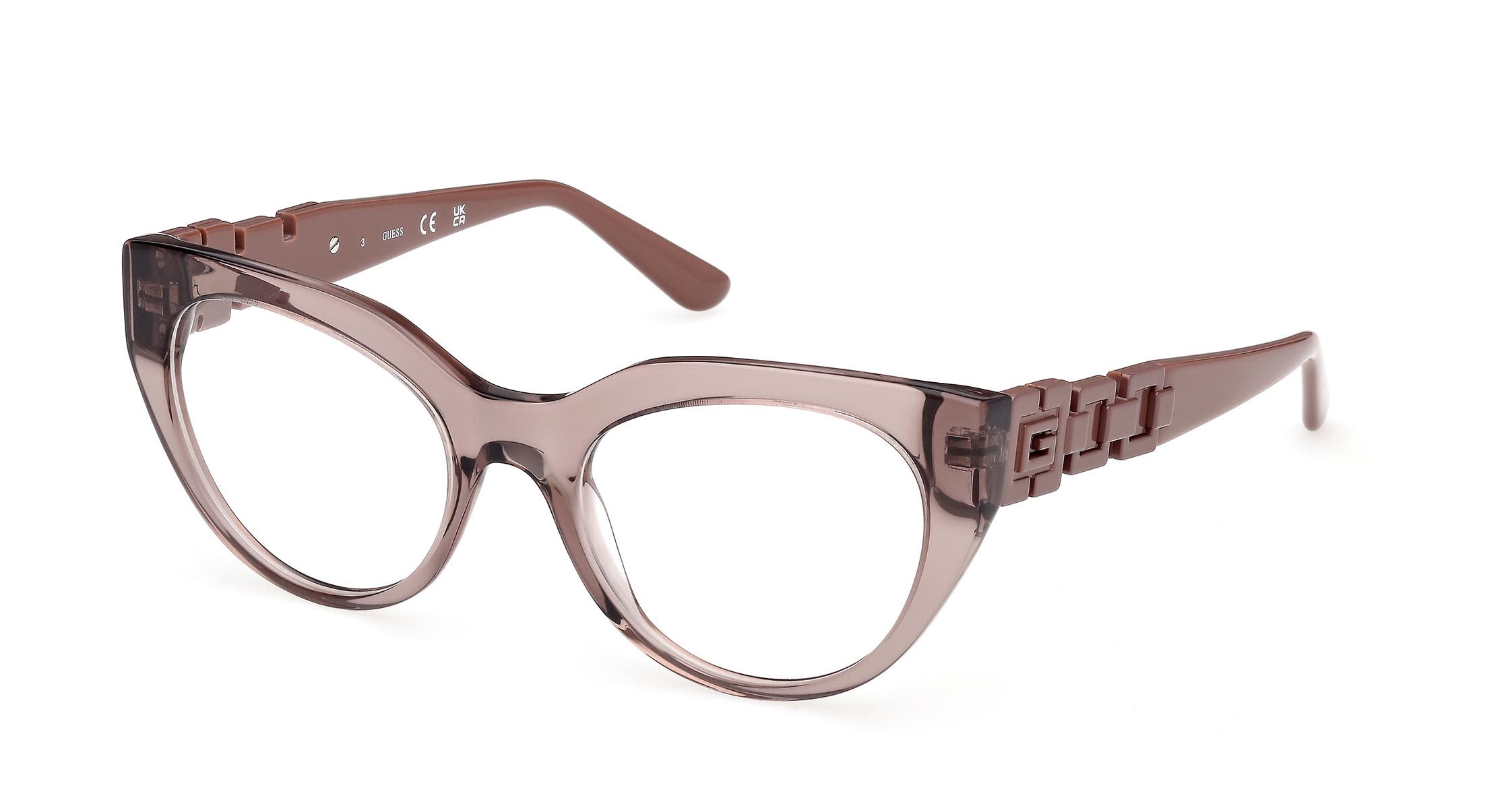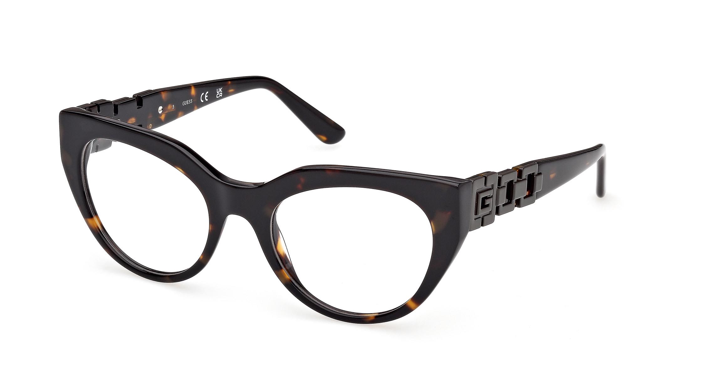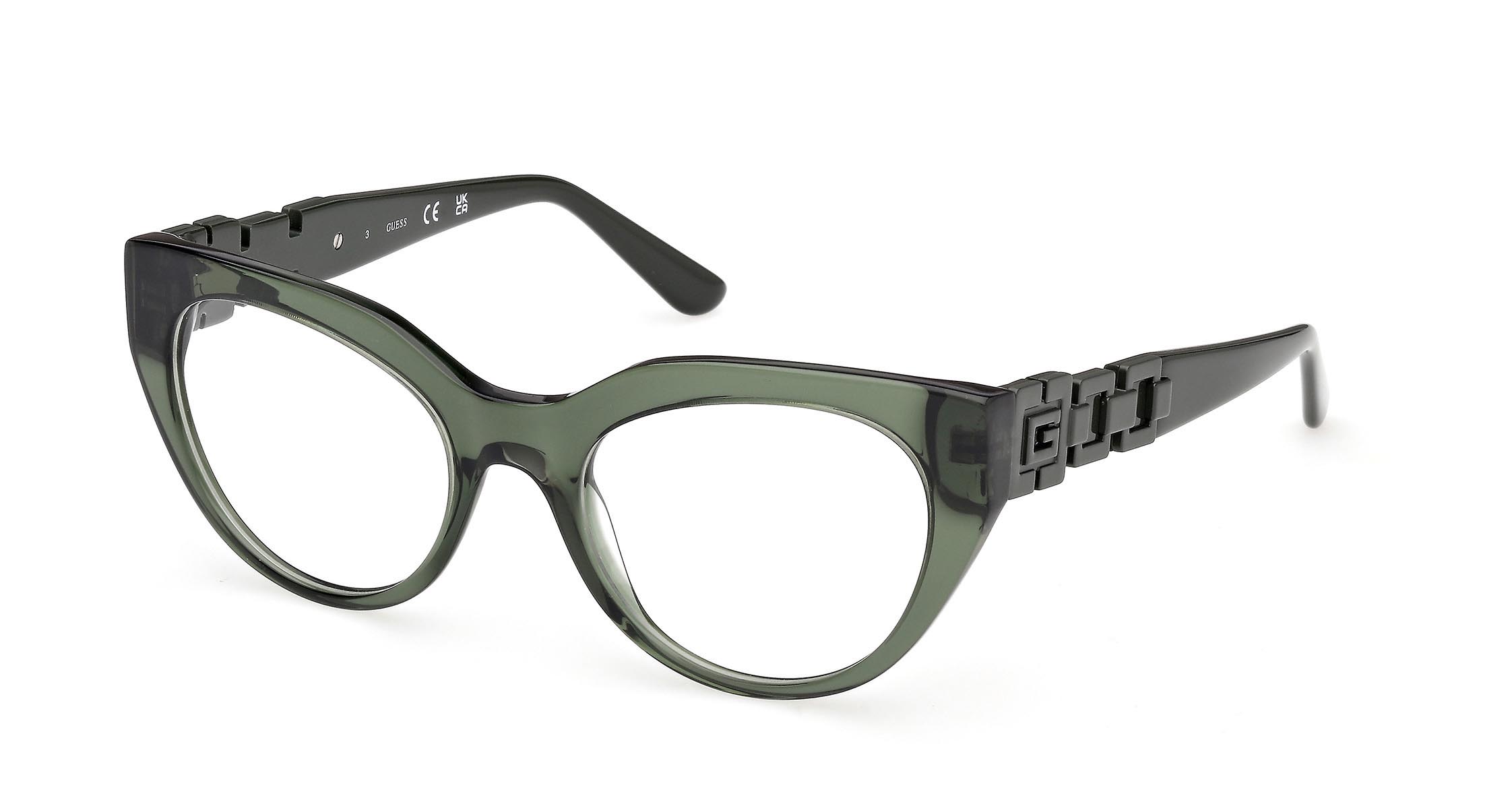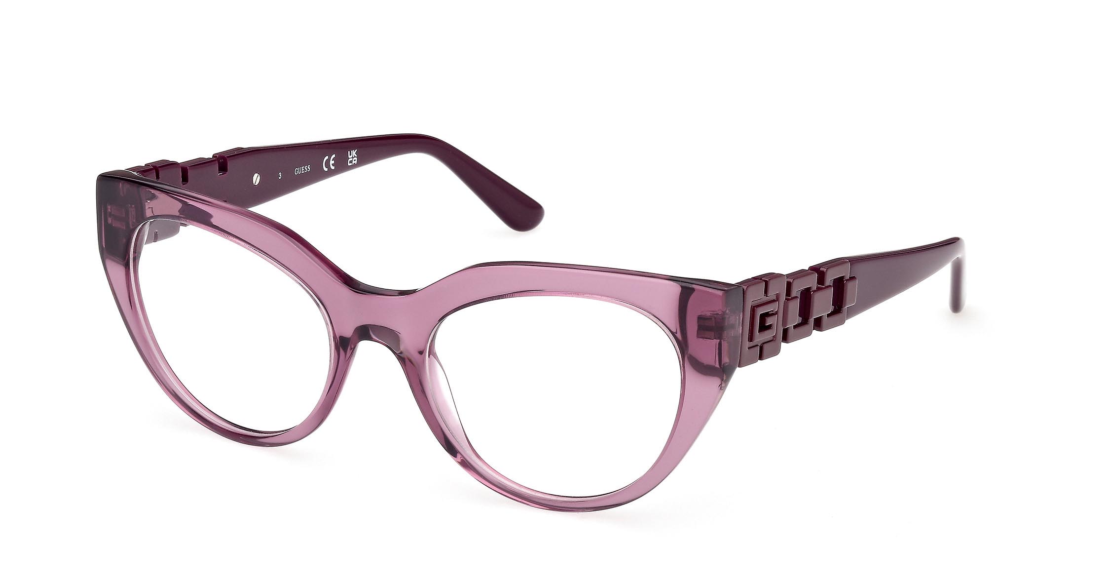 Occhiali cat-eye in acetato con angoli marcati sul frontale. Le aste in metallo smaltato riprendono il colore del frontale, mentre il logo “G” squadrato dà forma a una reinterpretazione della catena GUESS, con volumi e superfici in rilievo.