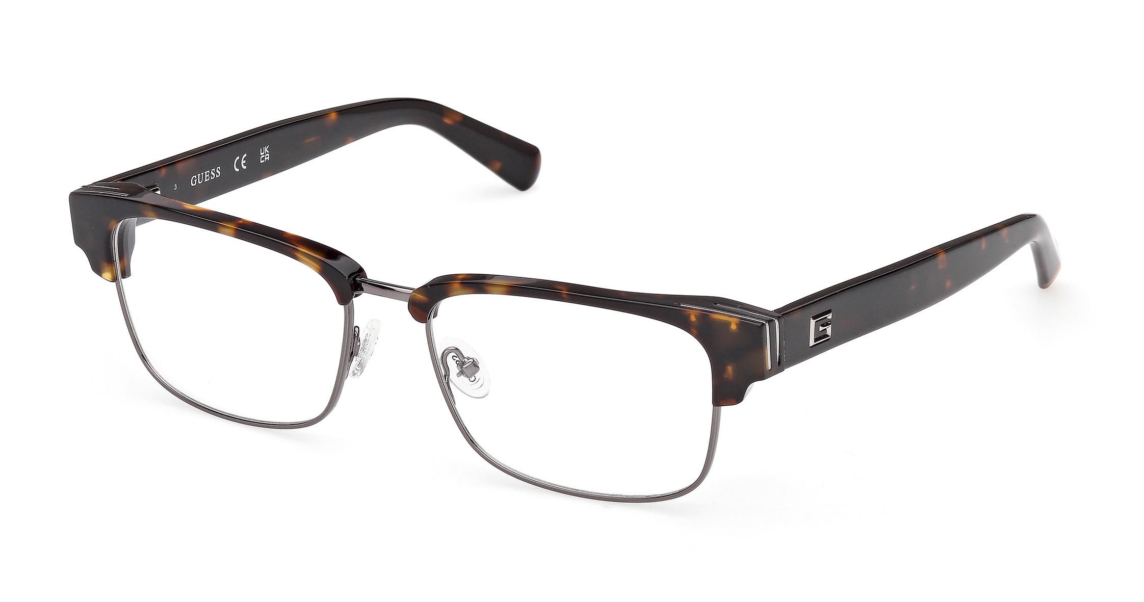 Montatura da vista stile browline con frontale rettangolare che combina metallo e acetato. Le aste sono impreziosite dal logo “G” squadrato inciso con effetto sfaccettato e da due linee metalliche che formano un dettaglio originale sulle cerniere.