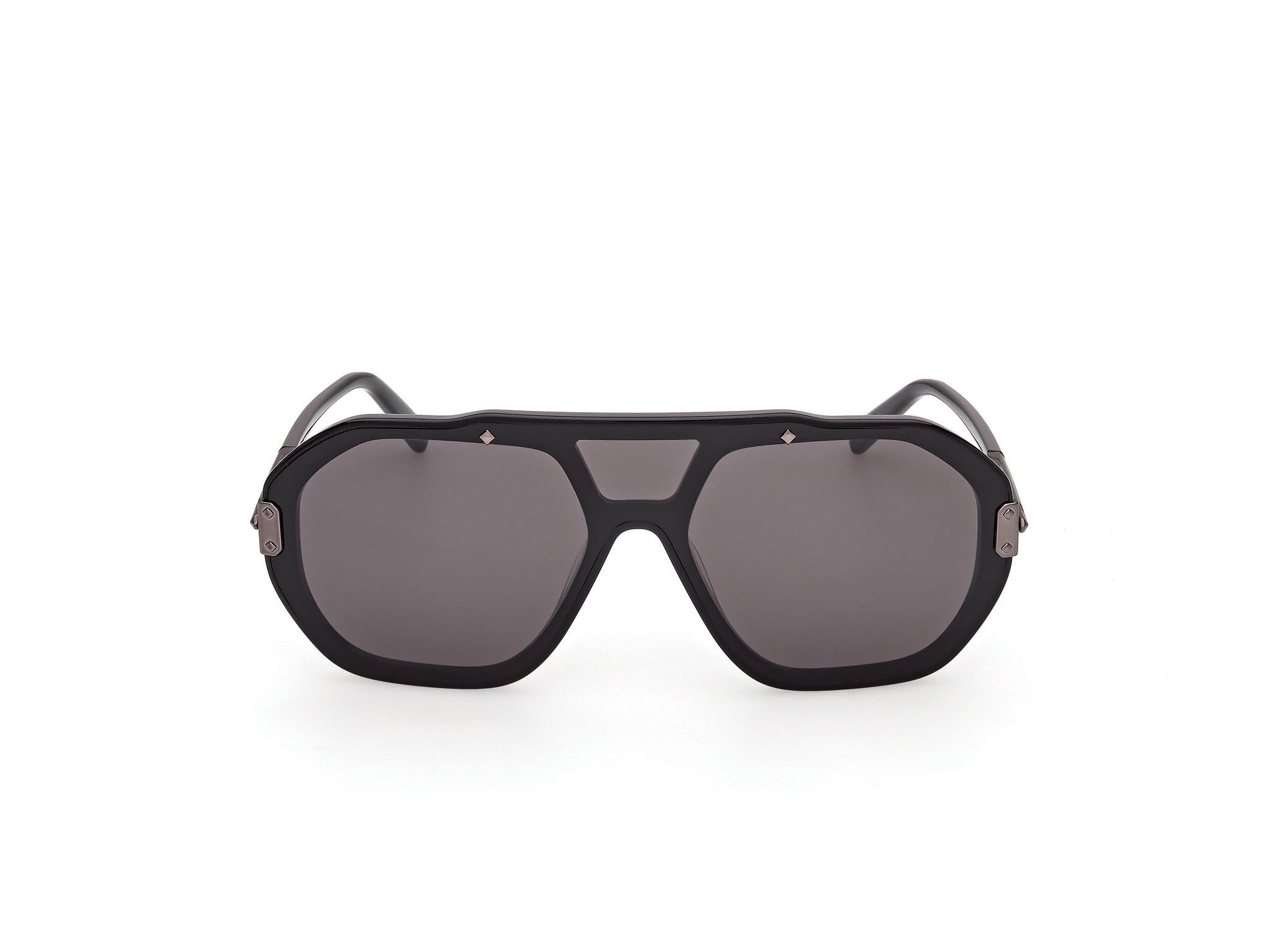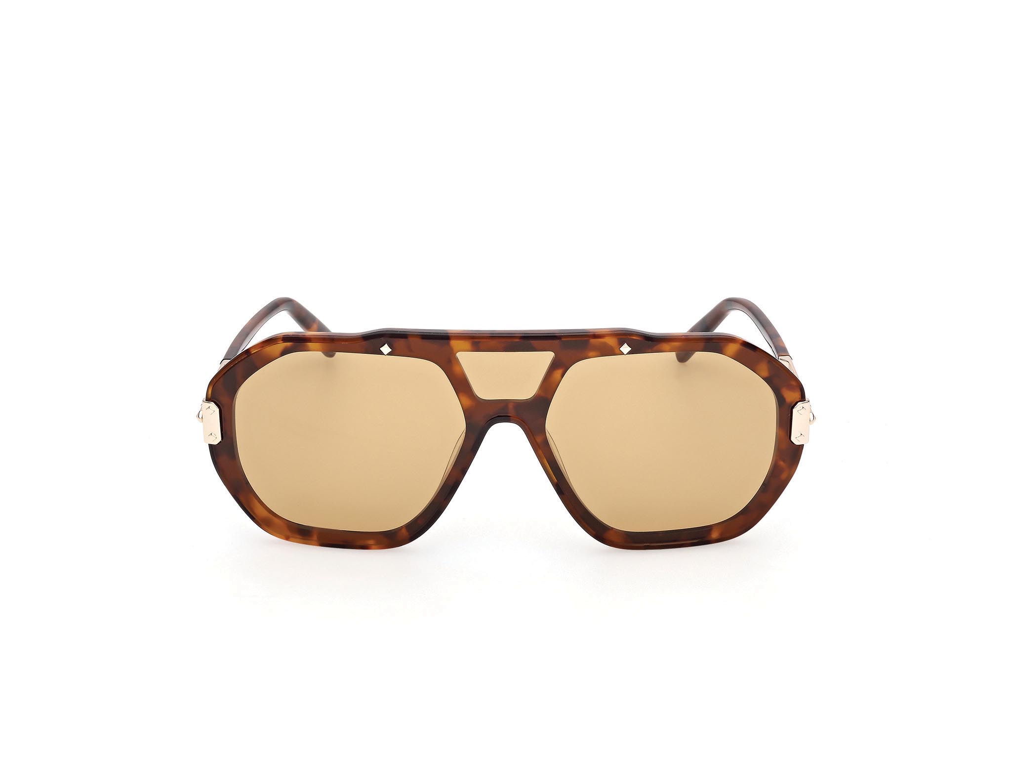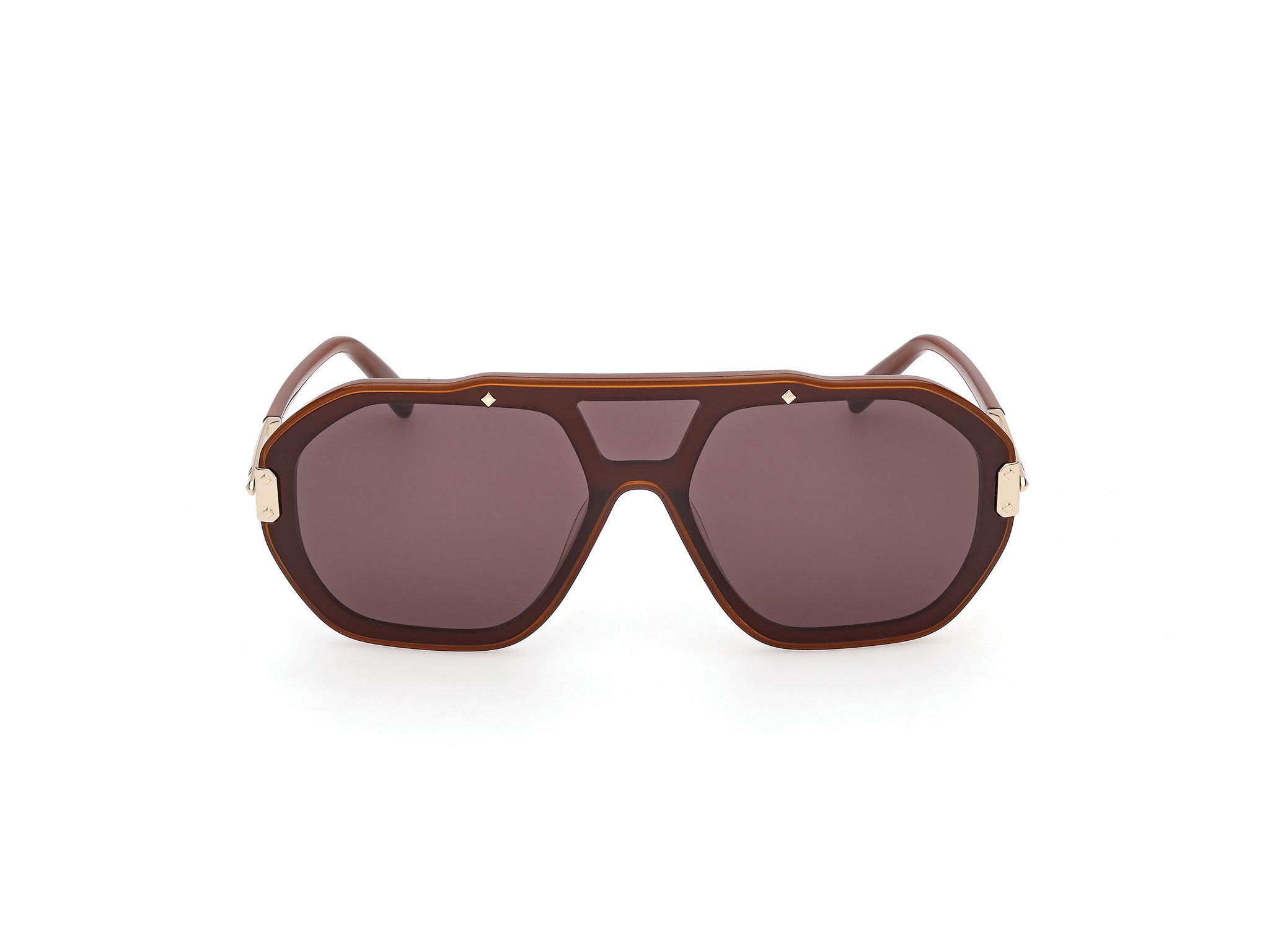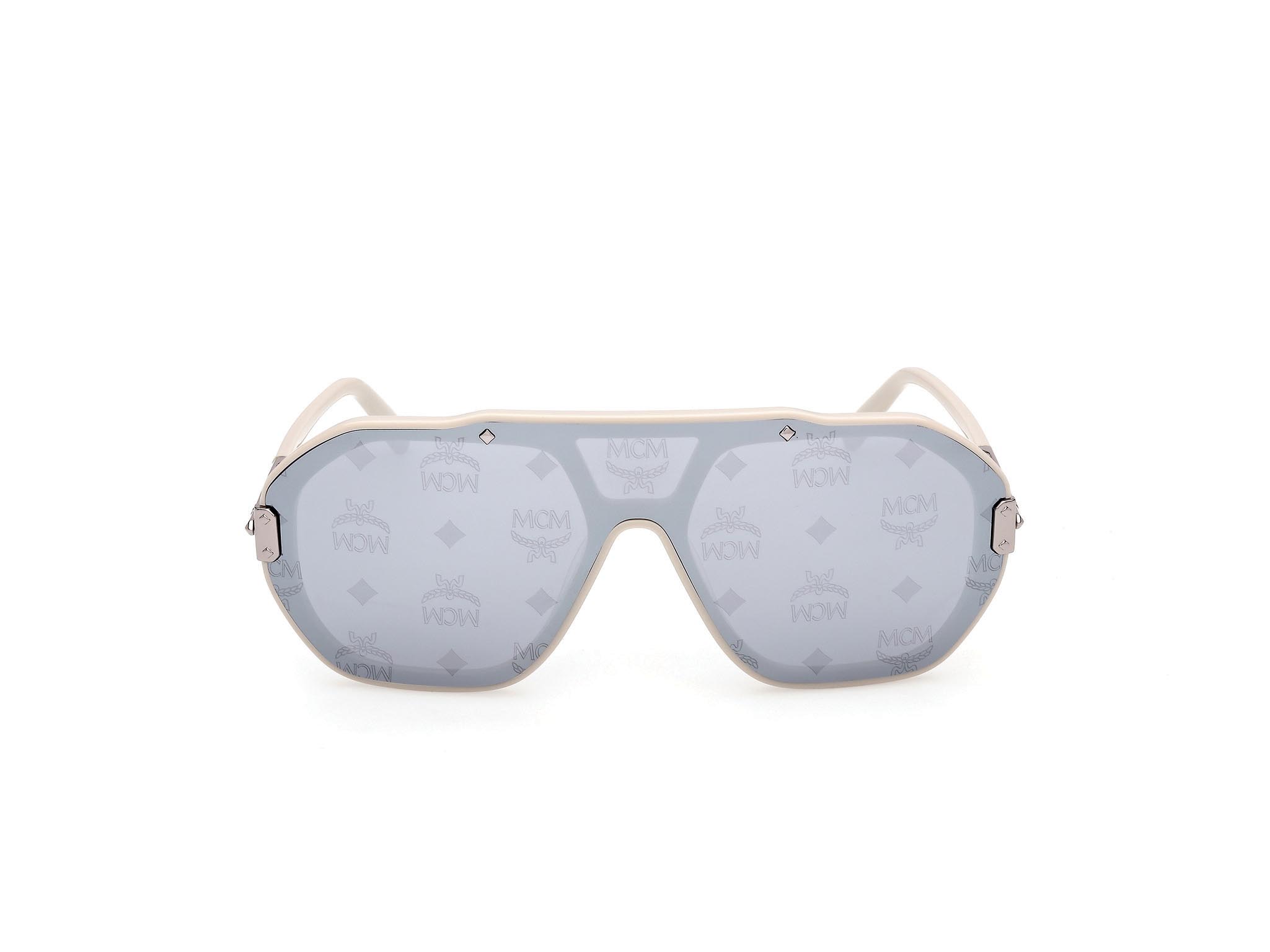 Modello geometrico mono-lente che rivela la struttura interna in acetato. Il frontale è impreziosito da dettagli metallici ispirati ai rinforzi angolari dei bagagli MCM e da delicati pin a diamante che richiamano la bandiera bavarese. Le aste in metallo con struttura tridimensionale a diamante sono completate da terminali in acetato e logo MCM lettering. La montatura include anche una versione con lente serigrafata con il pattern Visetos.