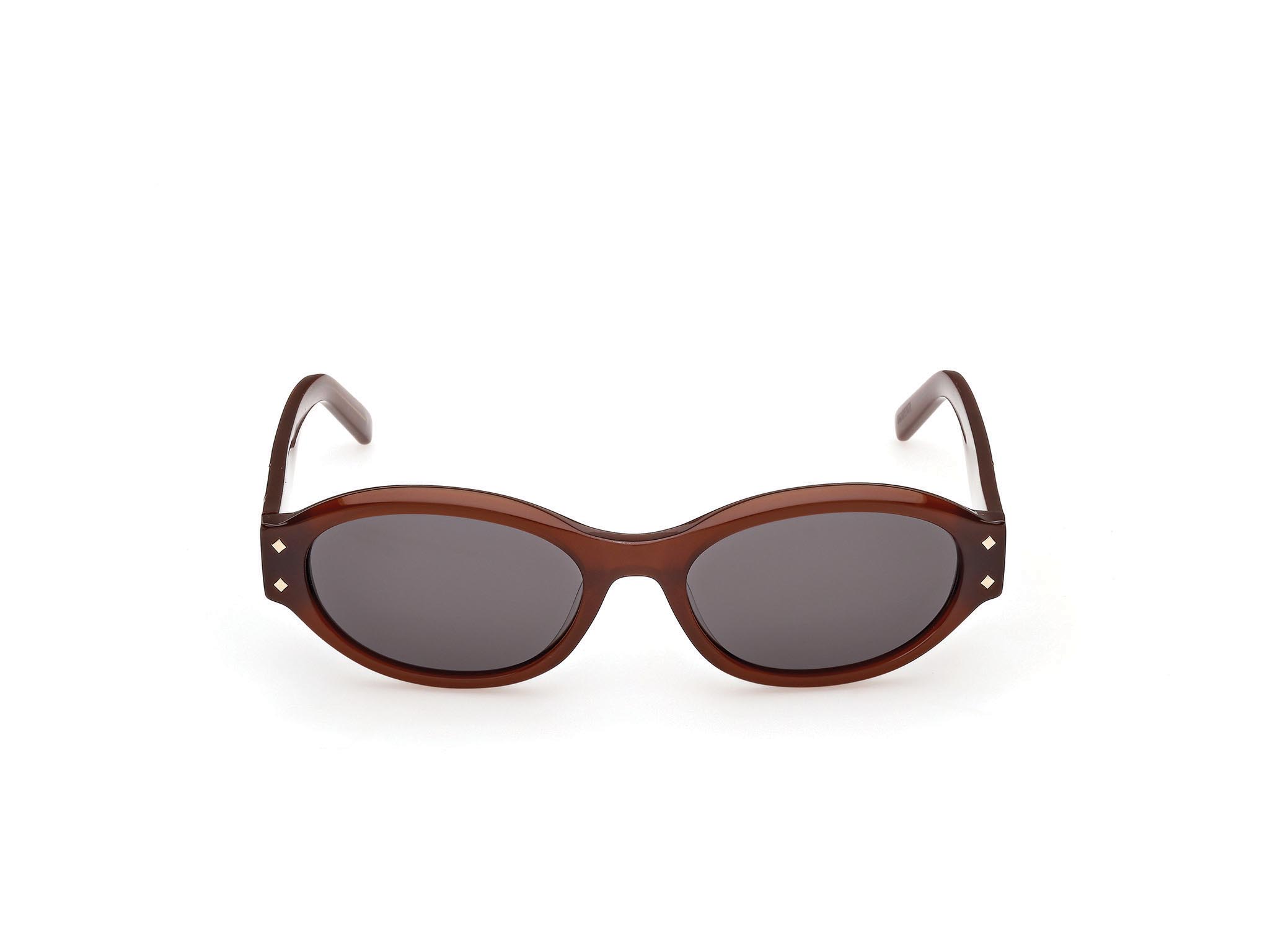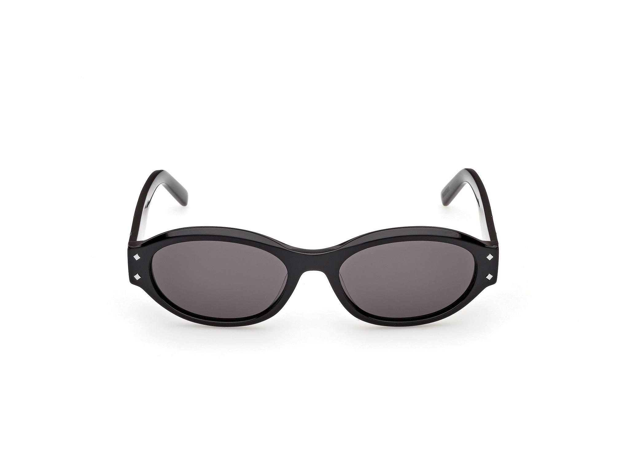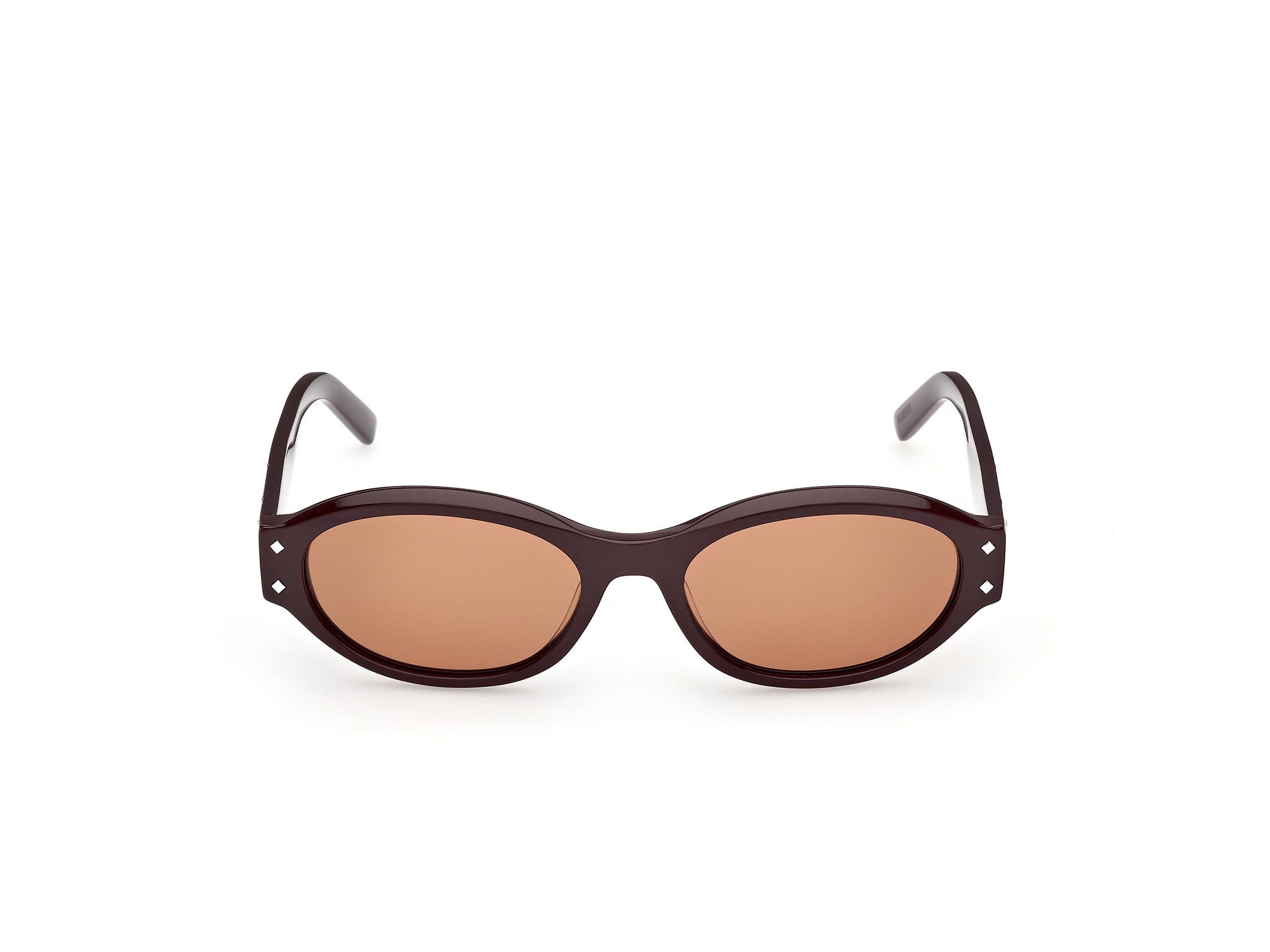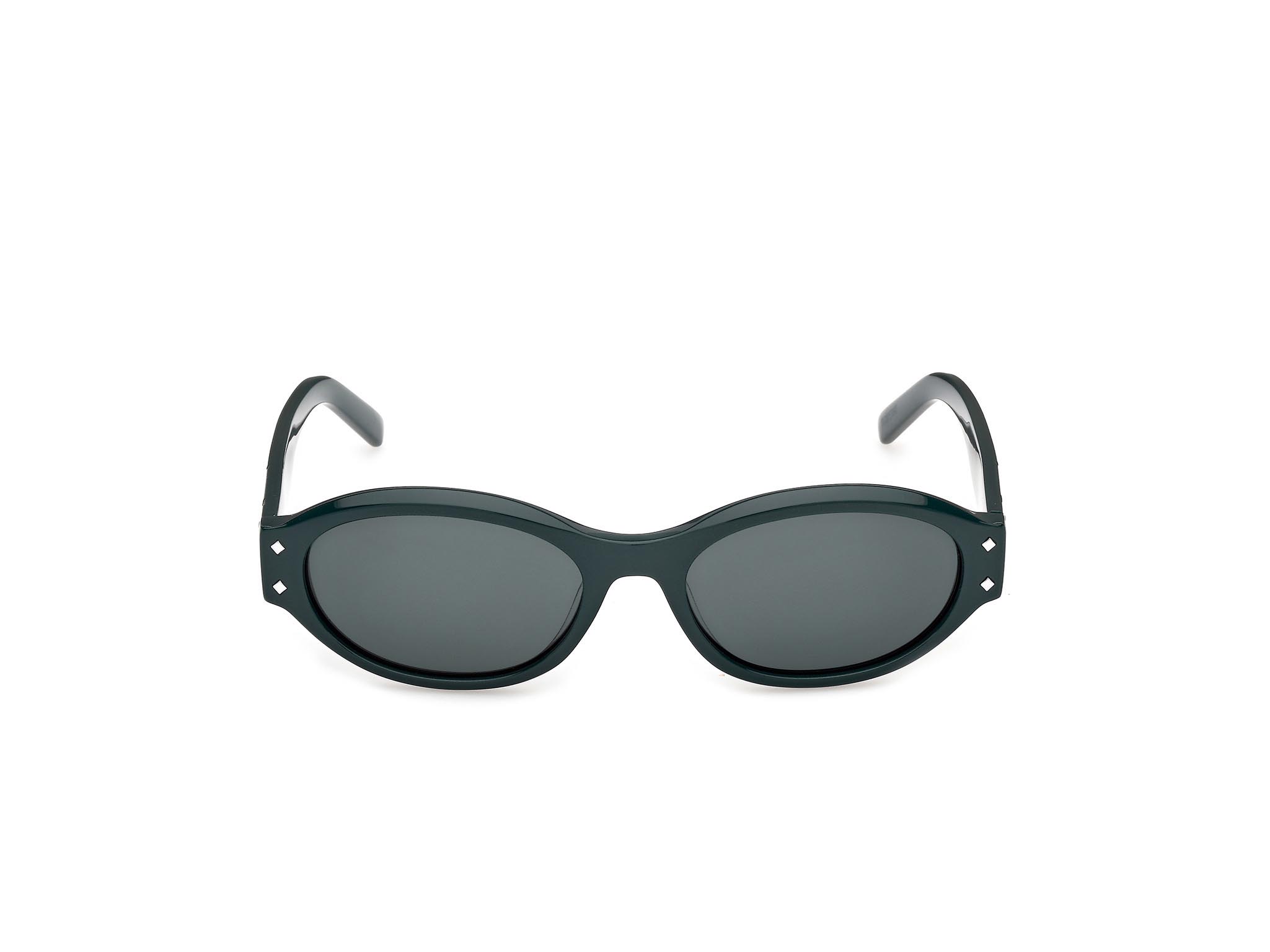 Occhiali da sole ovali in acetato che combinano raffinatezza e dettagli audaci. Frontale e aste sono decorati con pin a forma degli iconici diamanti presenti sulla bandiera bavarese. Il nuovo pattern Visetos 3D scolpisce le aste, creando un look femminile, deciso ma sofisticato.